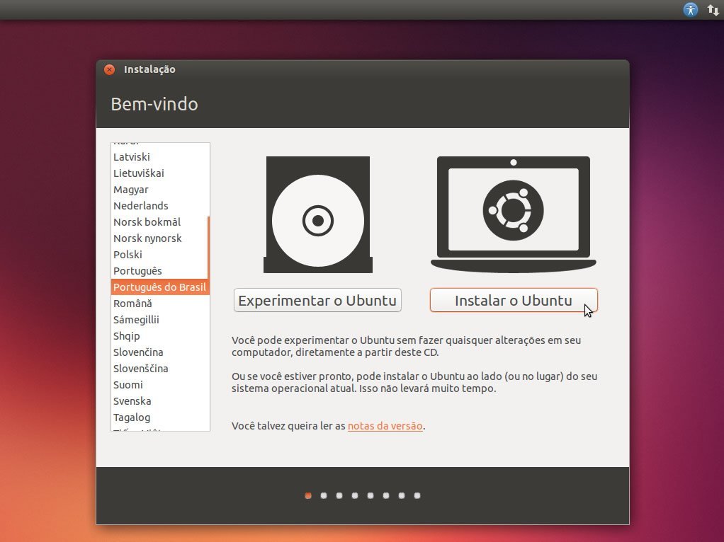 1)- Ligue o computador, coloque o CD/DVD ou pendrive do Ubuntu. Deixe o computador prosseguir com a inicialização do instalador. Hoje em dia a grande maioria dos computadores novos já saem de fábrica com a configuração para dar boot pela unidade de CD/DVD-ROM, portanto, se o seu computador não estiver com esta configuração definida, você deverá entrar no setup da sua máquina para setar essa opção.