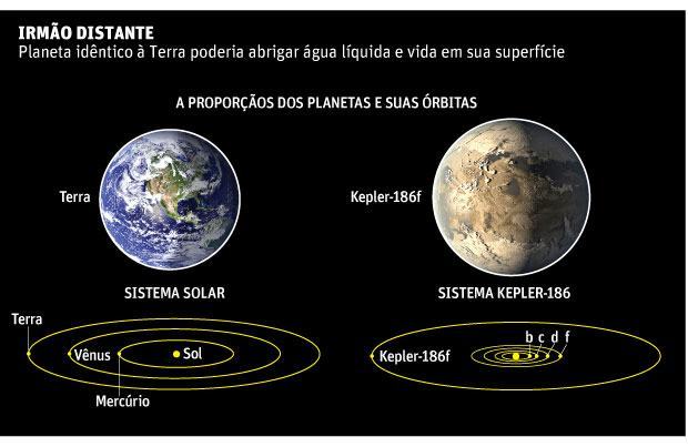 O anúncio foi feito na tarde de hoje numa entrevista coletiva conduzida pela Nasa (uma reportagem mais completa sobre o achado, produzida por este escriba, está nas páginas da Folha). O planeta orbita uma estrela chamada Kepler-186 e tem, segundo as estimativas, praticamente o mesmo diâmetro da Terra — 1,1 vez o do nosso mundo. Até onde se sabe, ele é o quinto a contar de seu sol e leva 129,9 dias terrestres para completar uma volta em torno de sua estrela. Ou seja, um ano lá dura mais ou menos um terço do que dura o nosso.