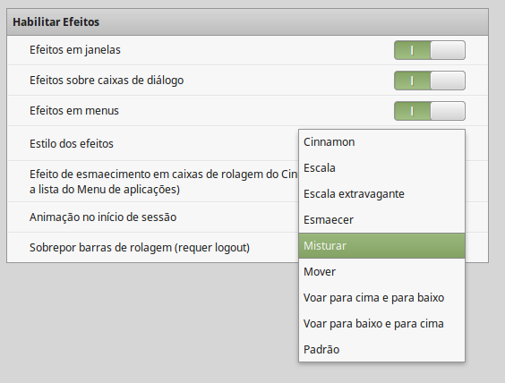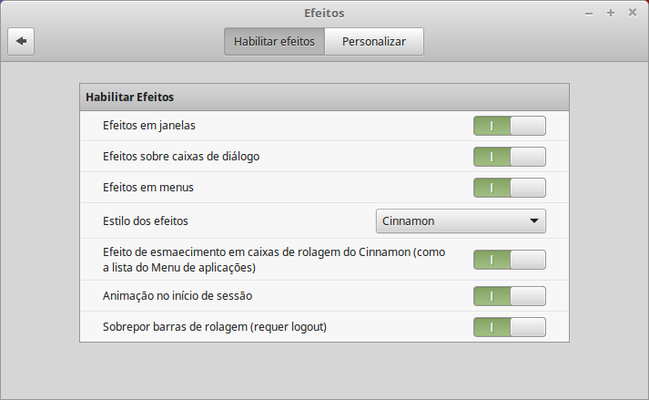 Caso queira alterar como são exibidos os efeitos durante as ações que acontecem no desktop, basta habilitar/desabilitar na Guia “Habilitar Efeitos”, ou alterá-los na guia “Personalizar”.