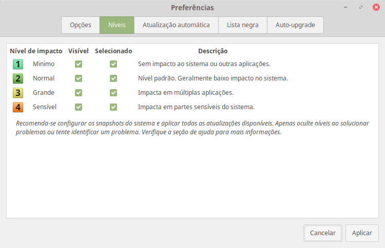 Agora ele exibe ainda 3 opções, mas elas mudaram. A primeira ainda faz a mesma coisa, escolhendo apenas as atualizações de segurança. A segunda trata de atualizar apenas os softwares. E a terceira depende de backups do Timeshift para a estabilidade do sistema. Se o Timeshift não estiver configurado, você verá um aviso.