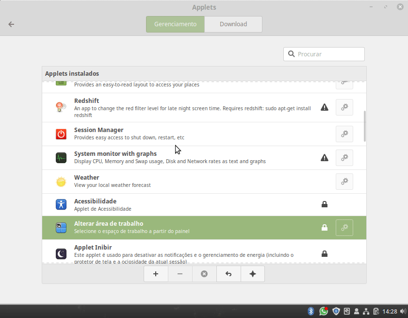 Repare na imagem abaixo que na aba Downloads você poderá baixar novos applets e na aba Gerenciamento você poderá adicioná-los à sua barra de tarefas e configurá-los.