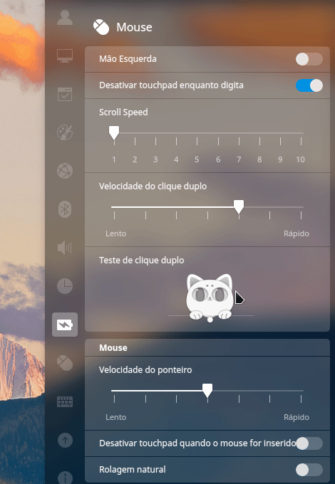 Eis um item que chama a atenção, pois quando você quiser configurar o sistema, clicando no ícone de configurações da dock ou com o botão direito do mouse na Área de trabalho e escolhendo configurações, ele chamará um painel na lateral direita da tela que concentra todas as configurações do sistema. Mas não é só isso. Entre as configurações vemos itens que não estão presentes nas maioria das distros, tornando as configurações do sistema mais completa e granular.